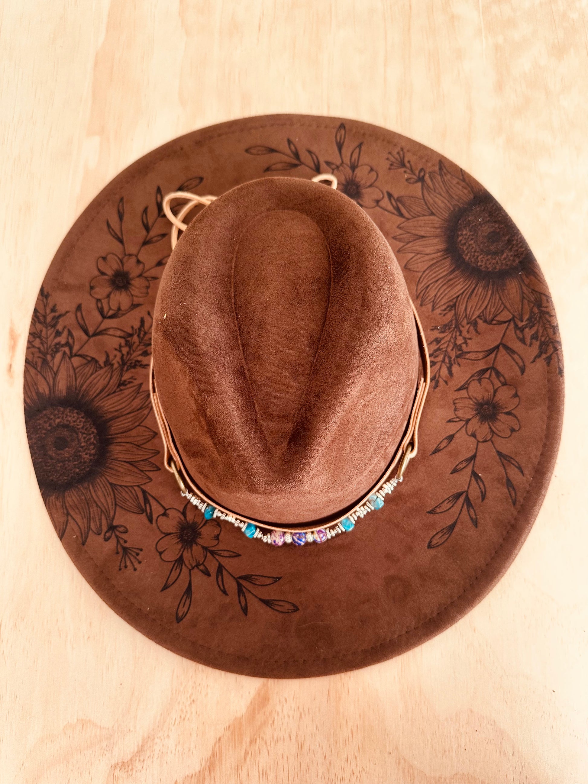 Each hat features a burned wildflower design, creating an earthy, one-of-a-kind look that adds character to any outfit. With its structured wide brim and soft vegan suede finish, it’s designed to be your go-to from market mornings to weekend adventures.